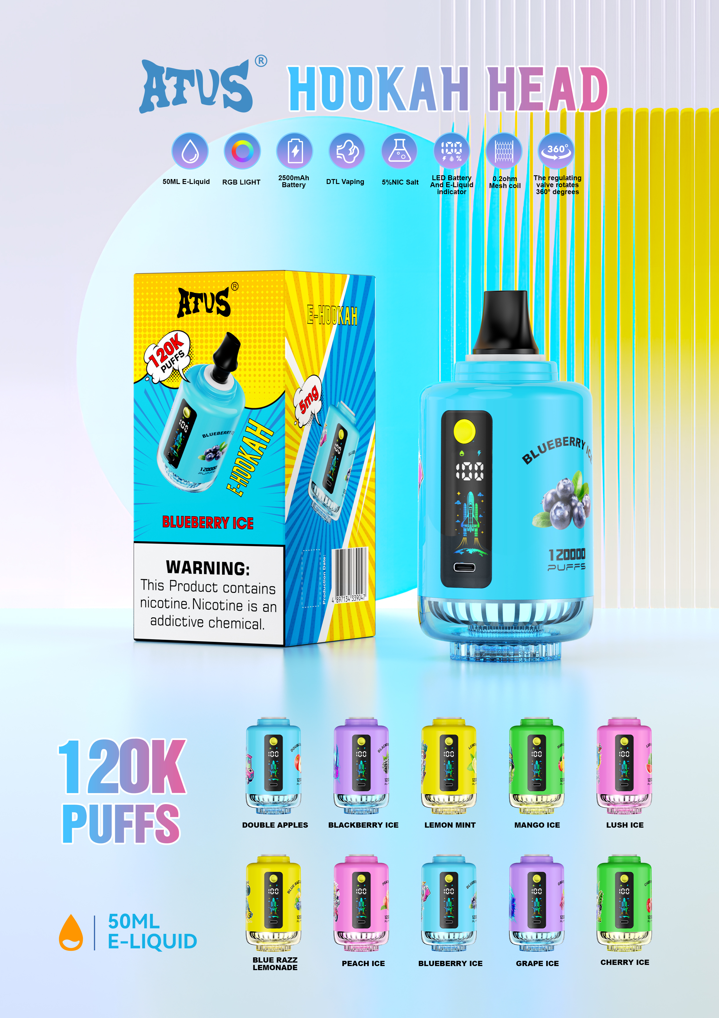 Elevate your vaping experience with the ATUS 120K Hookah disposable vape, a revolutionary device from a brand that honors hookah tradition while embracing modern innovation. ATUS, a leader in hybrid hookah-vape design, crafts devices that bring the luxury of a hookah lounge to your fingertips, and this model exemplifies that mission. Designed to replicate the authentic hookah shisha experience with its specialized mouthpiece and flavor profiles, it also incorporates cutting-edge features for convenience and enjoyment. With 120,000 puffs and 50ml of e-liquid, it’s built for extended use, letting you savor hours of hookah-style vaping without refills. The 2200mAh battery ensures long-lasting power, while the rechargeable Type-C port allows for quick, hassle-free charging—so you never miss a session. The LED display keeps you informed of battery life and usage, while the 0.2 ohm mesh coil and DTL vape style deliver rich, dense vapor that mirrors the smoothness of traditional hookah. Plus, the 360 rotating regulating valve lets you customize airflow to your preference, and the RGB light adds a vibrant, social-worthy touch to every puff.