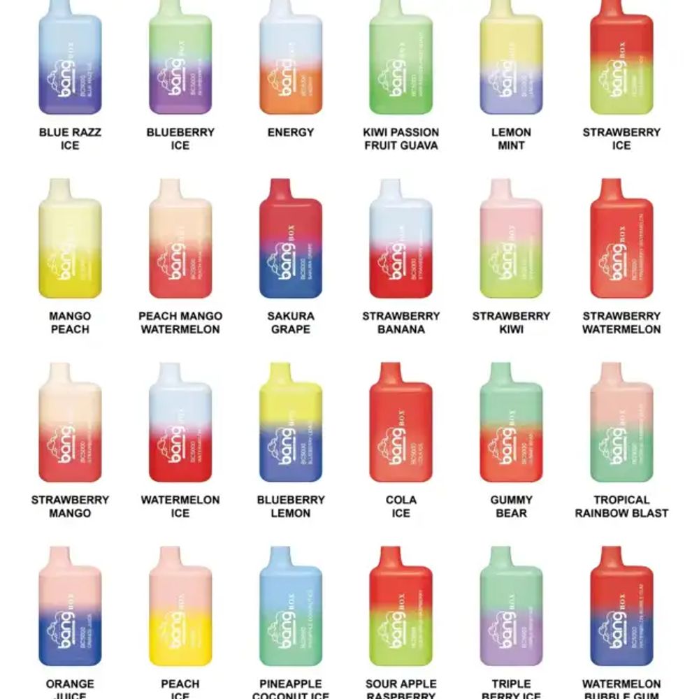 1.Strawberry Mango2.Strawberry Ice Cream3.Sakura Grape4.Watermelon Ice5.Blueberry Raspberry Ice6.Kiwi Fruit Passion Fruit Guava7.Watermelon Kiwi Fruit8.Energy Drink9.Peach mango watermelon10.Cool Mint11.Blueberry Ice12.Pineapple Coconut Ice13.Strawberry Guava14.Kiwi passion fruit guava15.Mixed Fruit16.Black Ice