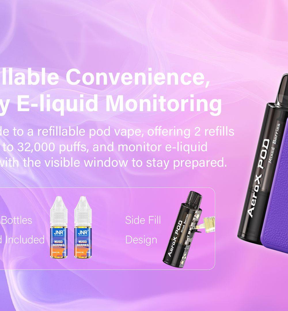 Key Features- Massive Puff Capacity: Enjoy up to 32000 puffs and 2 bottles of refillable e-liquid, ensuring extended use with refills.